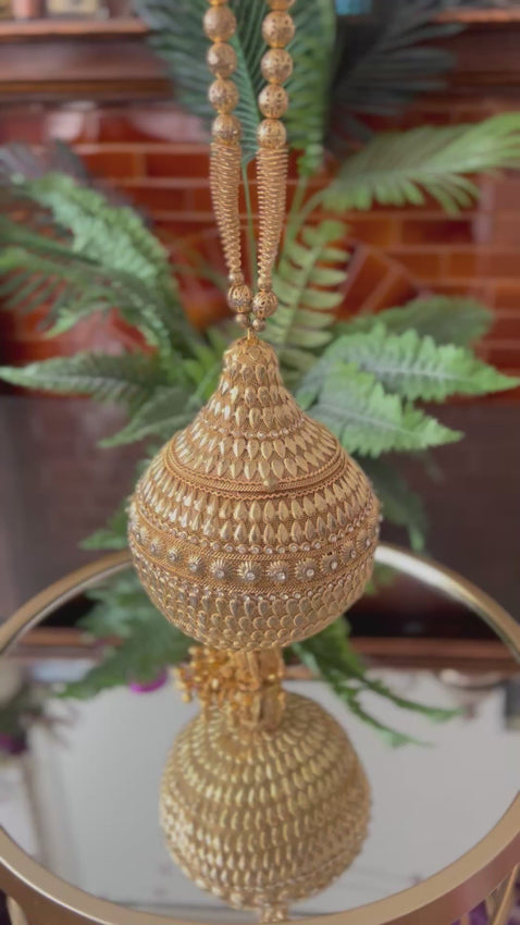 Complete your bridal look with this luxurious golden bag, embellished with sparkling stones.