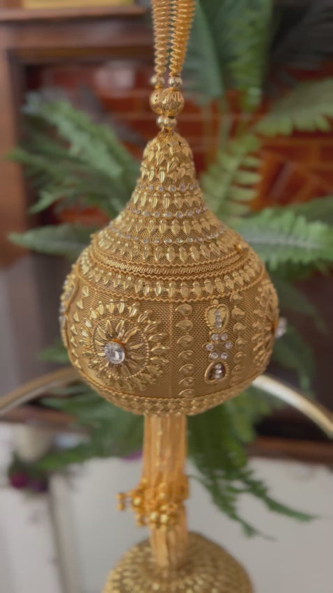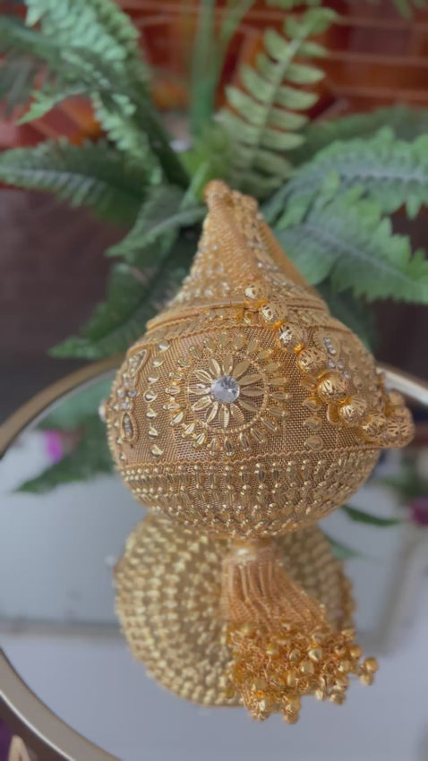 Complete your bridal look with this luxurious golden bag, embellished with sparkling stones.