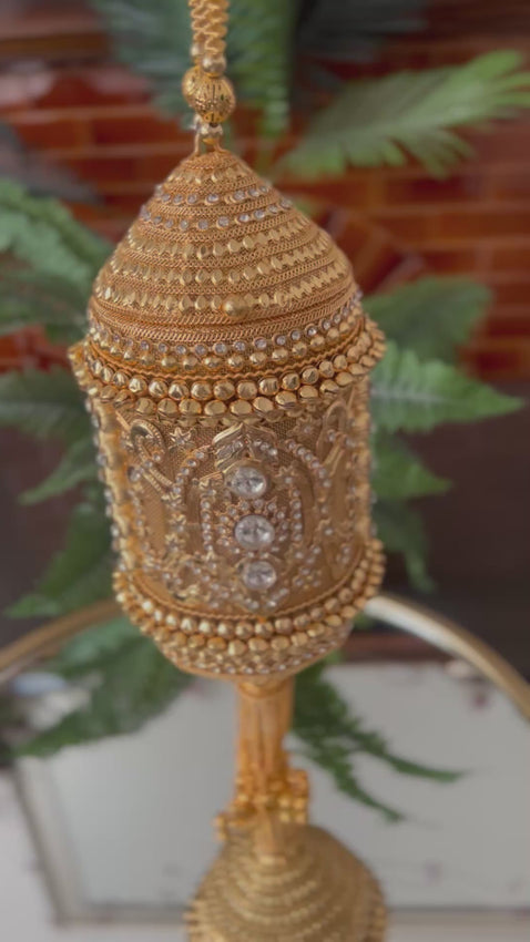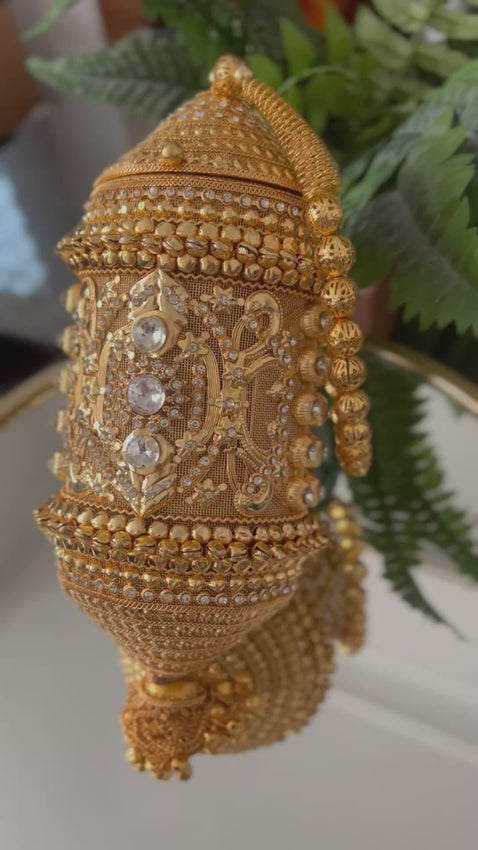 Complete your bridal look with this luxurious golden bag, embellished with sparkling stones.